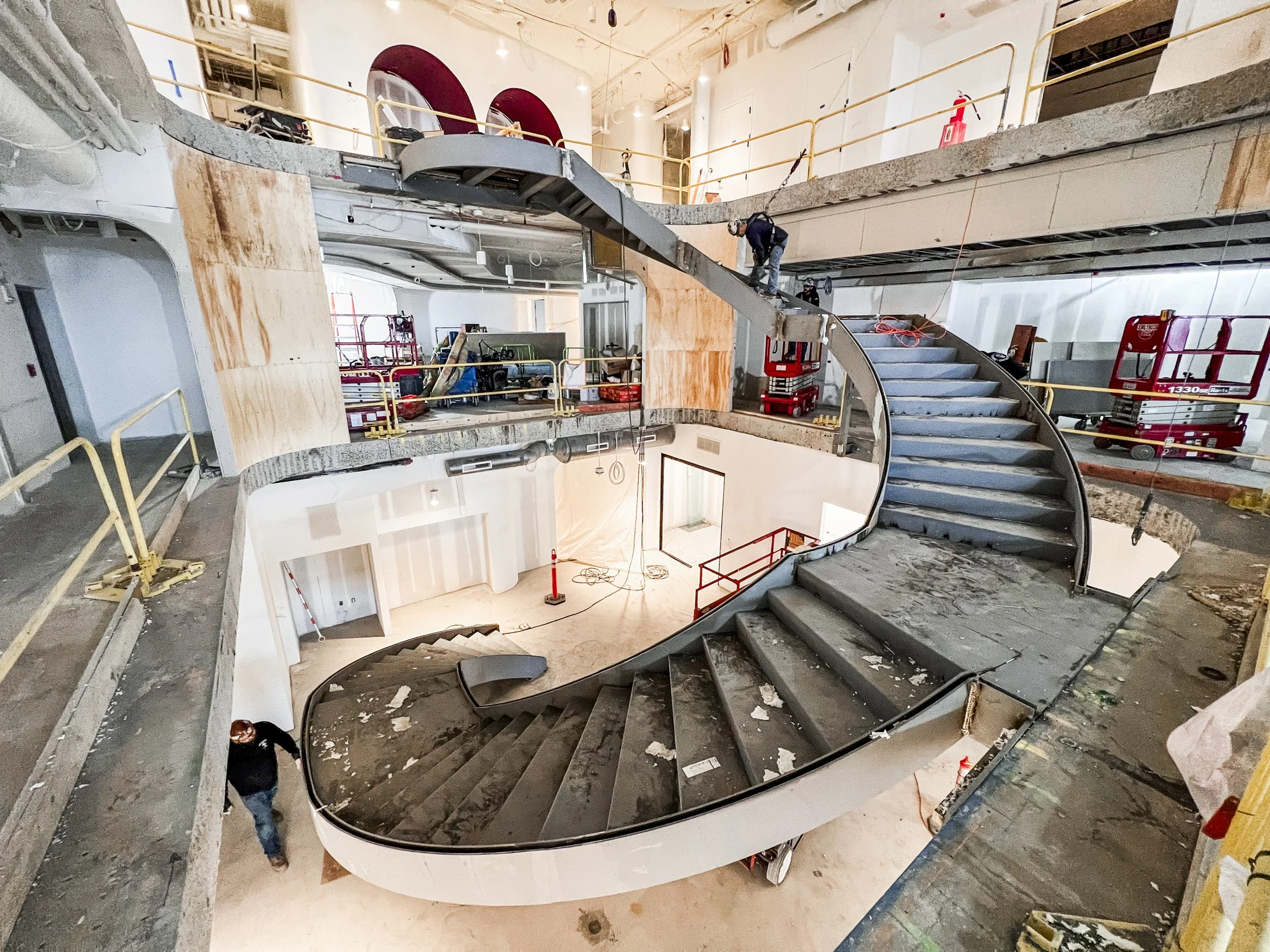 This high-profile project included two distinct feature stair installations. The first was a two-story helical spiral stair, requiring offsite fabrication and onsite assembly within a poured-in-place concrete building that lacked structural steel. The second was a stair system comprising three custom stair runs with stainless steel mesh panel railings. The unique constraints of the poured concrete environment demanded creative engineering and fabrication solutions.